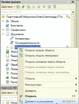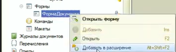 Заимствуем из основной конфигурации форму документа в расширение.