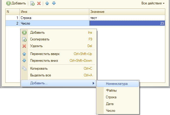 Теперь запускаем конфигурацию и добавляем элемент нашего справочника. При использовании стандартной команды формы Добавить перед выбором значения мы будем выбирать его тип. При добавлении через программно сформированные пункты контекстного меню значение будет приводиться к необходимому типу.