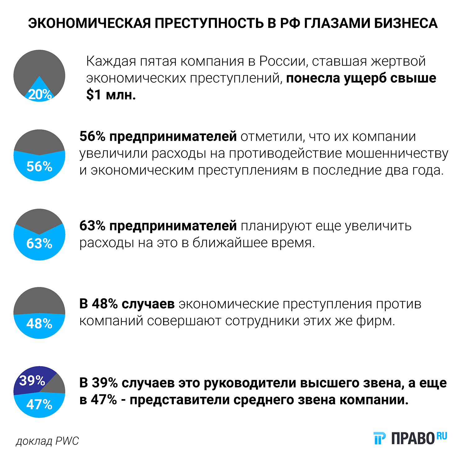 Так, большинство уголовных дел в отношении субъектов предпринимательской деятельности связаны с экономическими спорами и корпоративными конфликтами, которые должны быть рассмотрены в гражданско-правовом поле. Необоснованно возбужденные дела, «мертворожденные» и заказные, доходят до суда лишь в 17% случаев, из которых лишь 4% направляются в суд и завершаются вынесением обвинительного приговора. При этом на досудебной стадии к предпринимателю может быть применен весь комплекс приемов силового давления: изъятие документов и имущества, избыточные проверки, заключение под стражу, что нередко приводит к банкротству и потере рабочих мест.