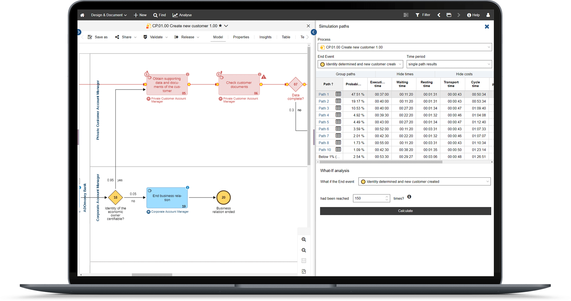 Оптимизация бизнес процессов – ADONIS позволяет использовать различные варианты оценки для оптимизации бизнес-процессов. В ходе моделирования процессов можно обнаружить узкие места или возможности, например сотрудников, чьи ресурсы в результате изменения ролей в процессах становятся излишними. Компонент бизнес-симуляции позволяет определять и анализировать критические пути, общее время реализации цикла, необходимость в ресурсах, время ожидания и т. д., а также сравнивать и оценивать возможные сценарии.