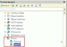 Платформа поддерживает создание конфигураций с интерфейсами на разных языках. Возможные языки отображения интерфейса добавляются в ветку общих объектов конфигурации: