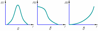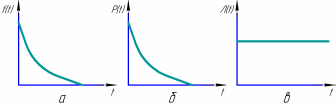 Зависимости основных количественных характеристик надёжности от времени приведены на рис. 3.5. Из рисунков и выражения (3.18) видно, что при k = l распределение Вейбулла превращается в экспоненциальное распределение. При k > l интенсивность отказов начинается с нуля и с течением времени возрастает. При k < l интенсивность отказов начинается с +∞ и в области больших t стремится к нулю.