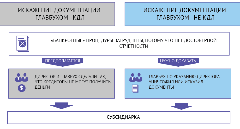 По мнению Верховного суда действия иных (кроме директора) лиц, в частности — главбуха, могут быть признаны причиной банкротства, если доказано, что эти действия привели к утрате или искажению бухгалтерских документов (п. 24 Постановления Пленума ВС от 21.12.2017 № 53).