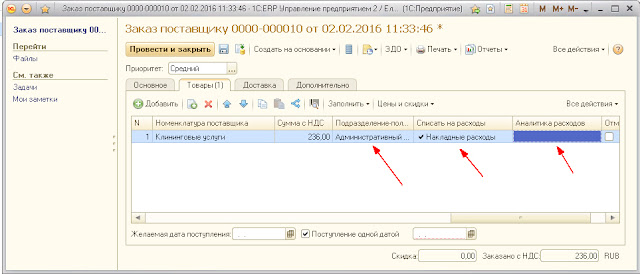 Если мы оформим на данную номенклатуру Заказ поставщику, то система позволит в табличной части Товары заполнить аналитики Подразделение-получатель, Статья расходов, и Аналитика расходов (признак, по которому данный расход будет впоследствии распределяться). Причем, Статья расходов будет обязательным реквизитом: