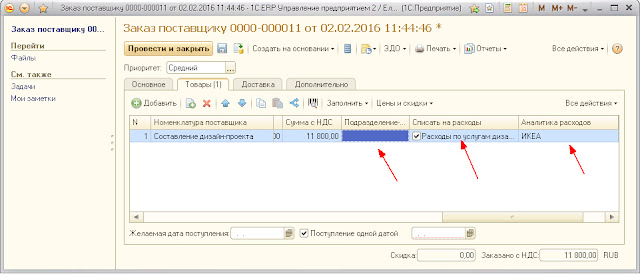 Если же заказ поставщику оформляется на номенклатуру с типом Товар — то поля Подразделение-получатель, Статья расходов и Аналитика расходов недоступны для заполнения:
