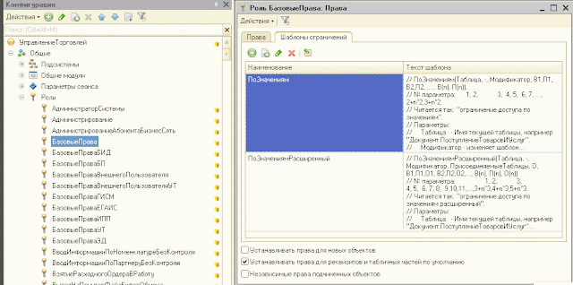Элементарной единицей подсистемы прав доступа является роль. Для роли в явном виде специфицируются особенности доступа к каждому из объектов конфигурации: