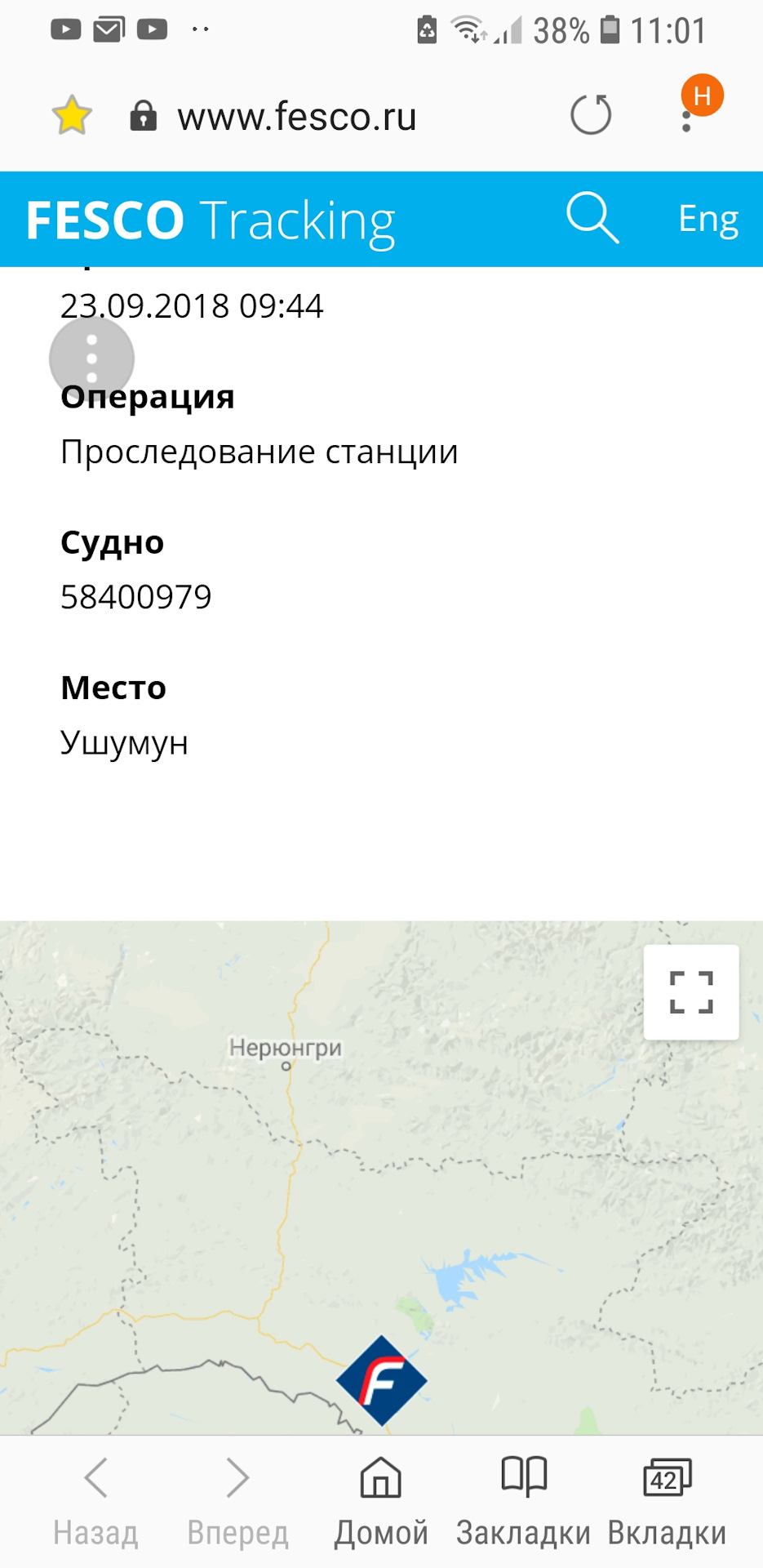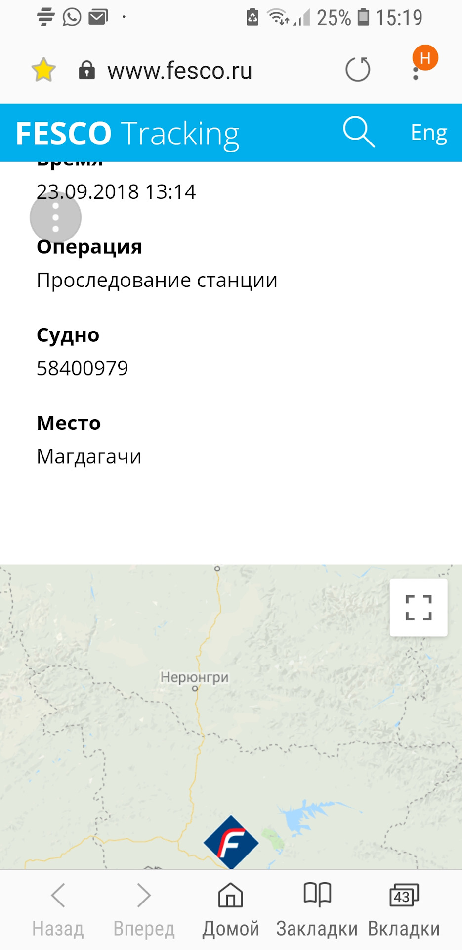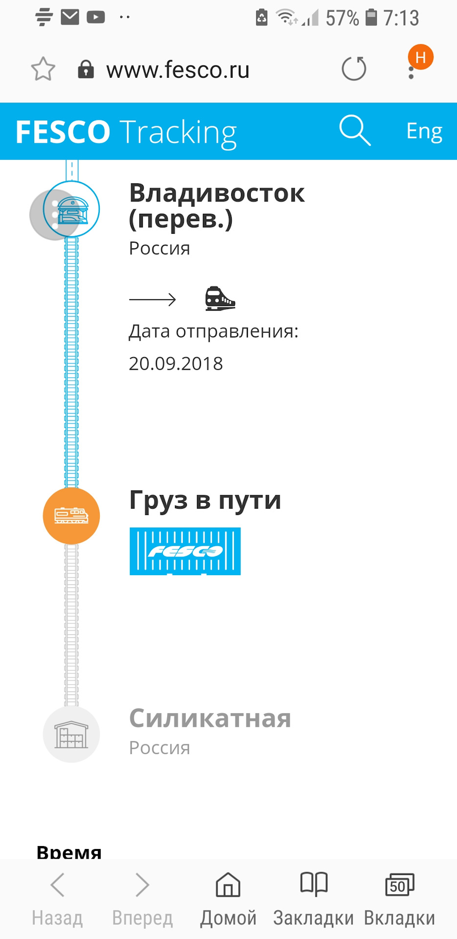За 2 дня контейнер преодолел расстояние от Владивостока до Бикина, к вечеру – в Будукан, на 4 день –в Ушумун, далее-Кендагиры, за неделю до Читы-1. Еще 3 дня и Красноярск уже позади, через 2 дня вагон долетел до Тюмени, тут радости не было предела, смотрю выходит на прямую, и скорость набрал после БАМа, как вдруг вагон на обгонном пункте 46 поехал назад на Восток. В итоге во Владивостоке на терминале простоял 12 дней и 13 дней был в пути.