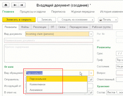 В экземпляре документа подобного вида, будут доступны дополнительные поля — в частности, вид обращения (персональное, коллективное или анонимное):