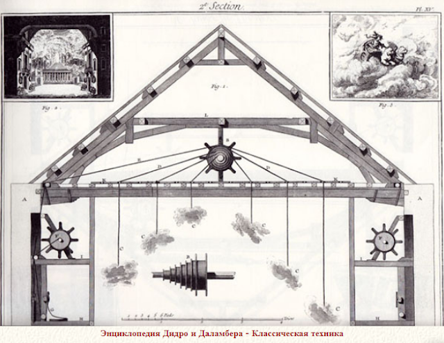 В первых придворных театрах были низкие потолки сцен. На современных сценах они носят название колосников. В те далекие времена художники делили живописную декорацию на подвижные боковые кулисы и на верхние падуги (поперечные к сцене полотнища, которые поднимались выше края зеркала сцены и опускались одновременно со сменой кулис).