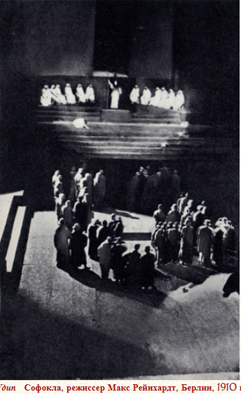 С просцениумом. Стремление некоторых режиссеров не ограничивать свое творчество в постановочных решениях пределами сценической коробки навело их на мысль использовать форму просцениума античного театра. С этой целью перед порталом сооружалась игровая площадка, как бы выдвинутая в зал авансцена.