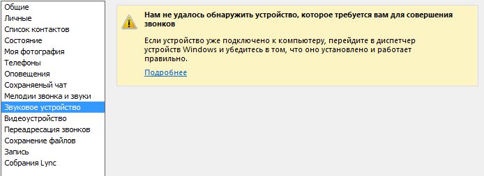 Звуковое устройство Skype for Business: «Нам не удалось обнаружить устройство, которое требуется вам для совершения звонков». |
