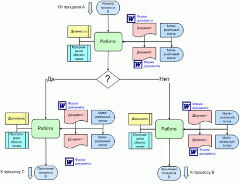 - Показывает альтернативы, которые происходят в процессе. Например, с помощью методологии вы можете описать ситуацию, когда договор на меньшую сумму согласуется с одной группой сотрудников, а на большую — с другой группой по более сложной технологии.