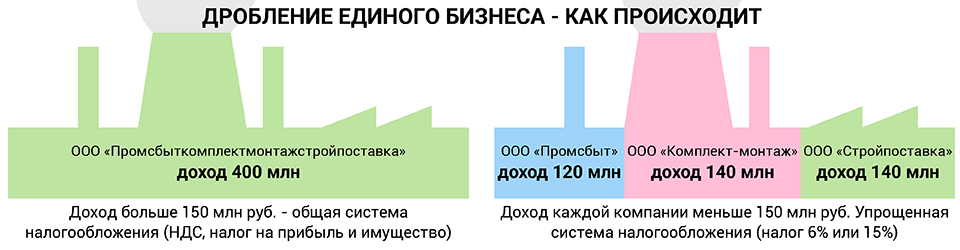 Таким образом незаконно экономят на налогах: применяют специальный налоговый режим, налоговые льготы и так далее. Один из самых частых случаев – дробление бизнеса с целью применять упрощённую систему налогообложения (УСН). На ней компании не платят НДС, налоги на прибыль и имущество. Их заменяют единым налогом – 6% от доходов или 15% от доходы минус расходы. Но воспользоваться таким выгодным режимом может только тот, чьи доходы не превышают 150 млн руб. (лимит для 2019 года). Если они больше, то бизнес могут «делить» на части, чтобы уложиться в лимит.