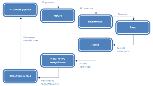 источник угрозы (с определенными характеристиками) с определенной долей вероятности инициирует событие угрозы, которое эксплуатирует уязвимость (имеющую определенную долю опасности, с учетом предварительных условий и успешного обхода защитных мер), вследствие чего создается негативное влияние (с определенной величиной риска как функции от размера ущерба и вероятности возникновения ущерба), которое порождает риск.