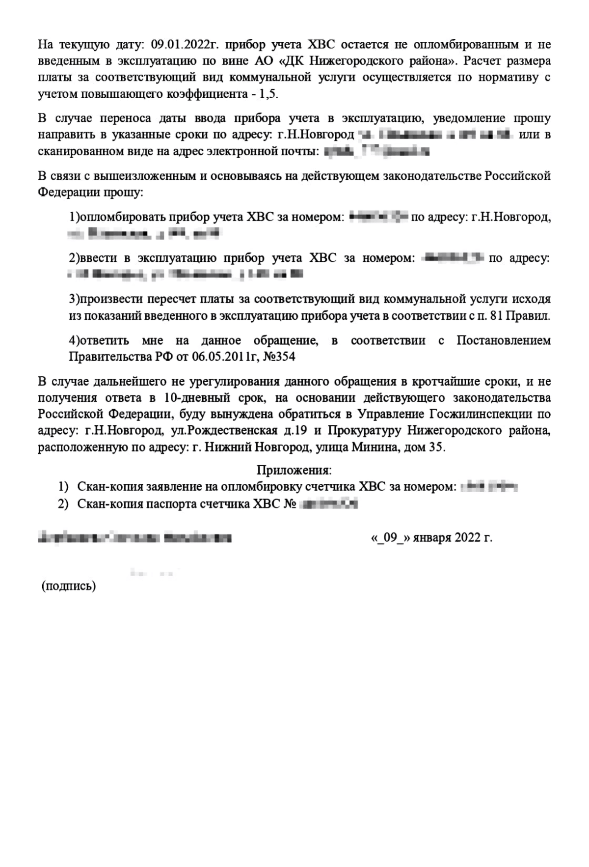 9 января 2022 года мы отправили по электронной почте жалобу на имя директора управляющей компании. В жалобе подробно описали сложившуюся ситуацию и приложили все необходимые документы: копии паспорта счетчика и заявления на опломбировку. Здесь же попросили сделать перерасчет с дня первого обращения в УК — об этом расскажу чуть ниже.