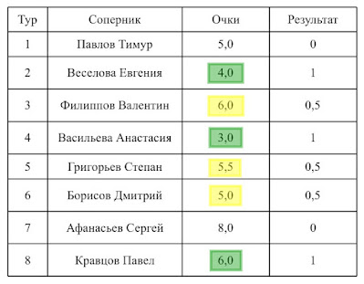 Теперь смотрим в таблицу и видим, что Антон выиграл во втором, четвёртом и восьмом туре (число очков в таблице выделено зелёным цветом) и сыграл вничью в третьем, пятом и шестом турах (число очков выделено жёлтым).