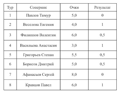 шахматного турнира, состоящего из 8 туров. В таблице показано количество очков,